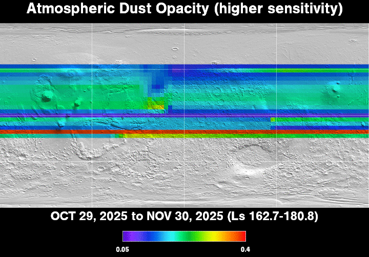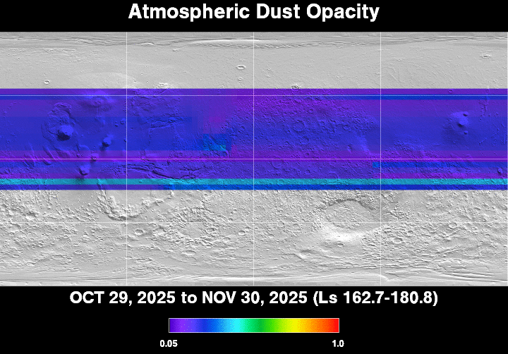 The Thermal Emission Imaging System (THEMIS) on NASA's Mars Odyssey orbiter is monitoring dust activity in the Martian atmosphere. The maps below go back to orbit 24400 (June 15, 2007). They show atmospheric opacity due to dust at an infrared wavelength of 9 micrometers. New maps are generated approximately every week, as data are received and spacecraft operations permit.