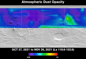 Scientists at Arizona State University's Mars Space Flight Facility use the Thermal Emission Imaging System (THEMIS) on NASA's Mars Odyssey orbiter to detect seasonal and yearly changes in the amount of dust veiling the Red Planet's atmosphere. THEMIS is a multiband camera that works at 9 infrared wavelengths and 5 visual ones.